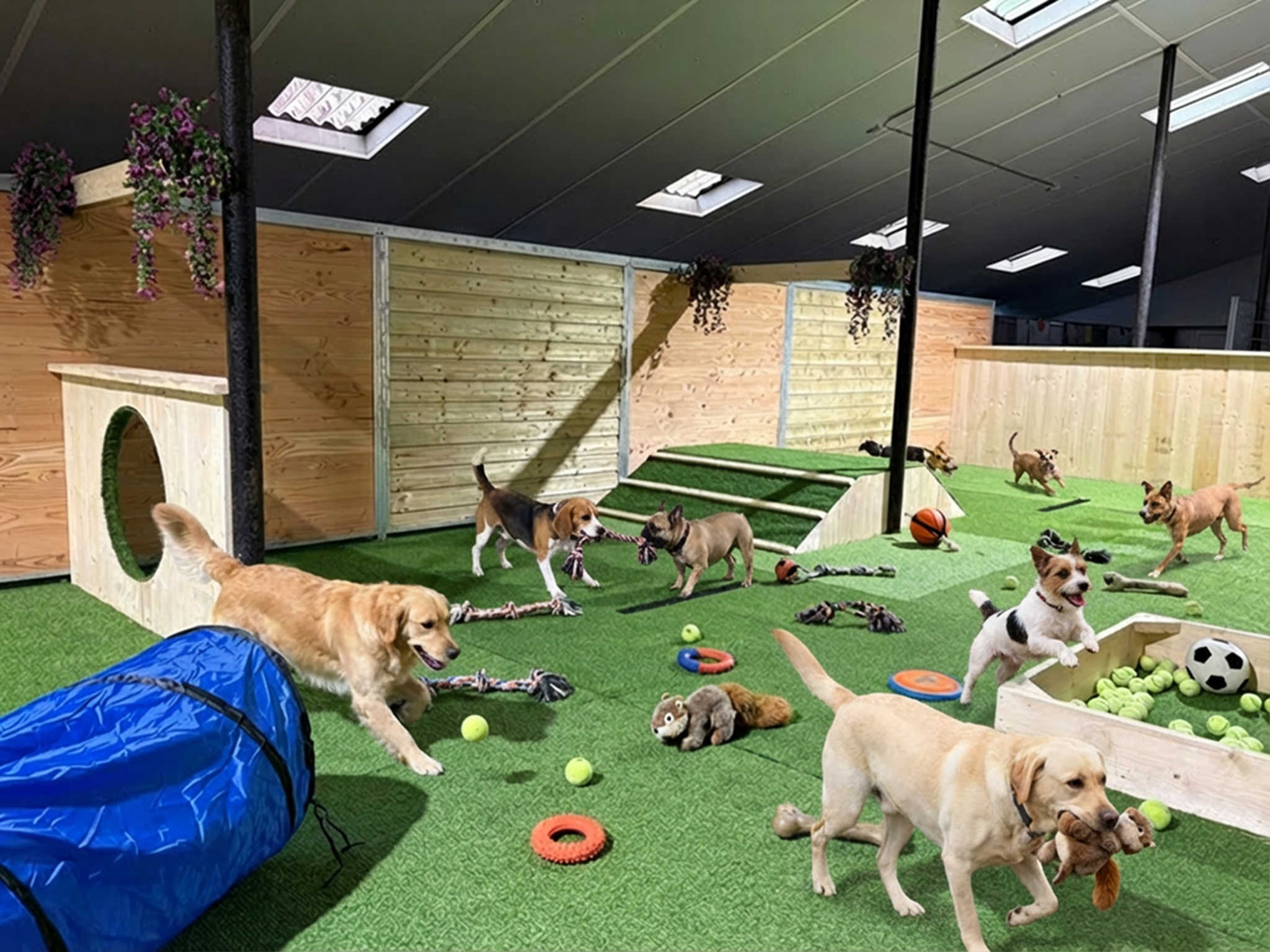 Met onze indoor speelhal wordt elke opvangdag een feestdag. Want blije honden? Daar worden wij ook blij van.